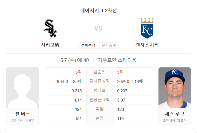 화이트삭스는 션 버크가 직전 경기에서 좋은 모습을 보였지만, 전체적인 불안정한 시즌 흐름과 타선의 무게 부족이 여전히 문제로 남아 있습니다. 반면, 로열스는 투타 모두 안정감을 갖추고 있으며, 홈 경기라는 이점까지 있어 우세한 전력을 유지하고 있습니다.