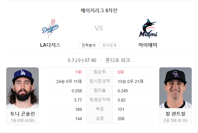 반면, 말린스는 최근 10경기에서 2승 8패로 부진한 모습을 보이고 있으며, 퀀트릴의 불안정한 피칭과 팀 전체적인 투수진의 부진으로 인해 어려운 경기가 될 것으로 보입니다. 전체적인 전력과 흐름을 고려할 때 다저스가 원정에서 승리를 거둘 가능성이 높습니다.