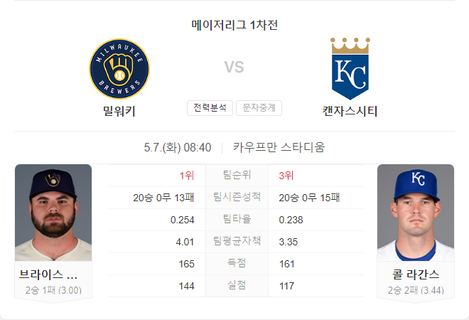 5월 7일 MLB 밀워키 브루어스 VS 캔자스시티 로열스 타카짱의 경기 예측 분석