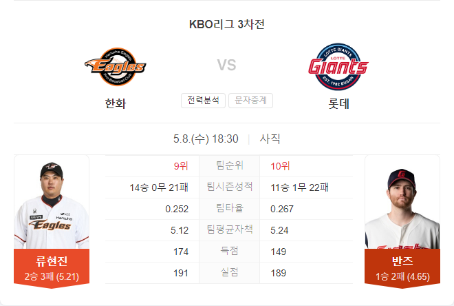 | 5월 9일 KBO 프로야구 한화 이글스 VS 롯데 자이언츠 타카짱의 경기 예측 분석 (0) | 2024.05.09 |