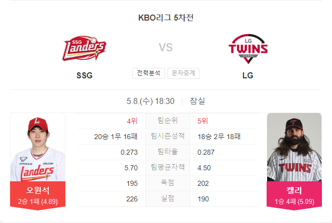 5월 8일 KBO 프로야구 SSG 랜더스 VS LG 트윈스 타카짱의 경기 예측 분석