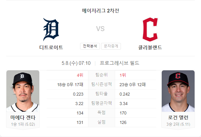 이번 경기는 두 팀 모두에게 중요한 대결이 될 것입니다. 디트로이트는 분위기 반전을 노리며, 클리블랜드는 선두 자리를 유지하기 위해 싸울 것입니다. 마에다와 앨런의 투수 맞대결이 관건이 될 전망이며, 클리블랜드의 홈 이점이 경기 결과에 큰 영향을 미칠 수 있습니다. 전반적으로 치열한 경기가 예상되며, 클리블랜드가 소폭의 우위를 점할 것으로 보입니다.