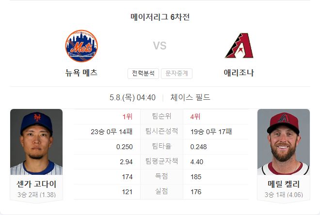양 팀 모두 공격력이 뛰어나지만, 선발 매치업에서는 메츠가 확실히 우위를 점하고 있습니다. 센가는 안정적인 피칭과 더불어 애리조나전에서도 좋은 성적을 기록하고 있어 기대가 큽니다. 반면 켈리는 메츠 상대 약세와 함께 최근 팀 투수진의 흔들림도 고려해야 할 부분입니다.