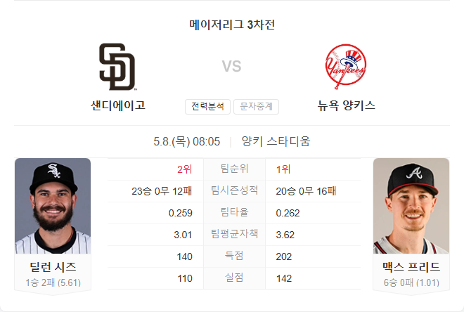 양 팀 모두 리그 상위권 전력을 갖추고 있지만, 이번 경기의 선발 맞대결에서는 맥스 프리드가 명백한 우위를 보이고 있습니다. 파드리스는 불펜의 힘으로 많은 승리를 챙기고 있지만, 선발 딜런 시스의 부진과 양키스전 약세는 우려 요소입니다.