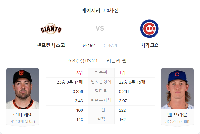 자이언츠는 내셔널리그 서부지구 3위를 유지하고 있으며, 상위권 경쟁이 치열한 상황에서 다저스와 2.5게임, 파드리스와는 2게임 차로 바짝 추격 중입니다. 최근 콜로라도와의 홈 4연전에서 3승 1패를 거두며 흐름을 탔으나, 이번 시리즈 1차전에서는 컵스에 2-9로 완패했습니다.