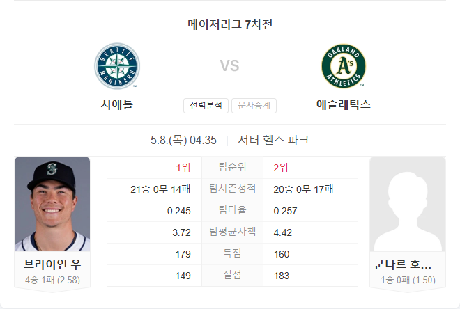 두 팀 모두 이번 시리즈에 강한 동기를 가지고 있으며, 특히 홈에서 매리너스를 상대로 반전을 이끌어내며 기세가 좋은 상황입니다. 하지만 선발 매치업에서는 브라이언 우가 경험과 안정감에서 우위를 보이고 있으며, 최근 피칭 내용 또한 매우 뛰어납니다.