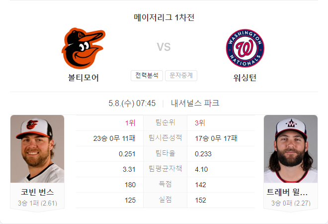 5월 8일 MLB 볼티모어 오리올스 VS 워싱턴 내셔널스 타카짱의 경기 예측 분석