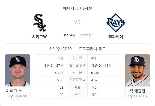 이번 경기는 두 팀의 현재 폼과 홈/원정 경기력을 고려할 때 탬파베이 레이스가 유리할 것으로 보입니다. 특히 에플린은 홈에서 더 강한 모습을 보여주었고, 화이트삭스의 공격력이 부진한 가운데 소로카의 불안정한 피칭도 레이스에게 유리하게 작용할 것입니다.