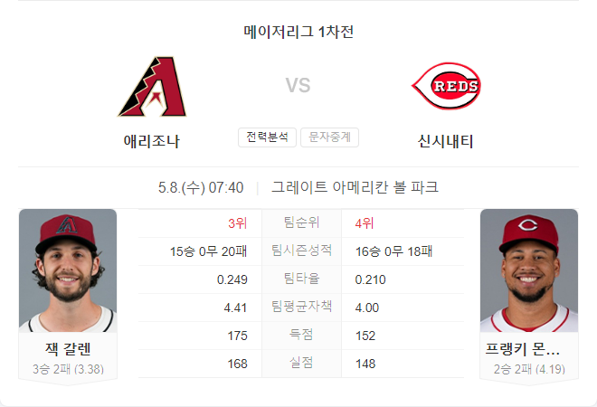 반면, 프랭키 몬타스는 부상 복귀 후 첫 등판에서 크게 흔들리며 팀에 부담을 주었습니다. 애리조나는 강한 타선을 바탕으로 신시내티의 투수진을 공략할 가능성이 높으며, 신시내티는 최근 타선 부진을 극복하고 반등할 필요가 있습니다. 갤런의 이전 성적과 몬타스의 불안정한 복귀 등을 고려할 때 애리조나가 우위를 점할 가능성이 높습니다.