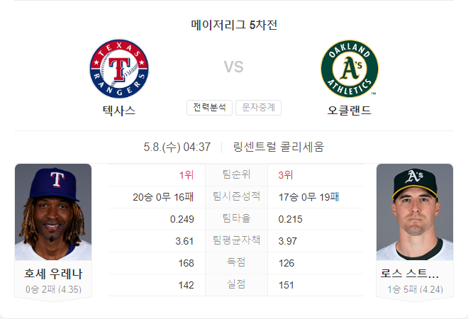 5월 8일 MLB 텍사스 레인저스 VS 오클랜드 어슬레틱스 타카짱의 경기 예측 분석