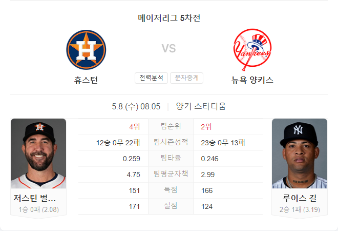 양키스는 홈에서 강한 모습을 보여주고 있으며, 휴스턴은 올 시즌 원정에서 고전하고 있습니다. 벌랜더가 강력한 모습을 보여줄 가능성이 높지만, 양키스의 불펜과 타선의 힘이 애스트로스를 압도할 것으로 예상됩니다.