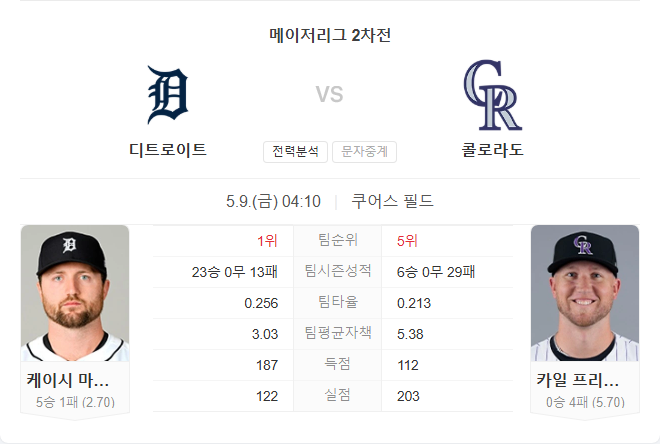 전력 차이가 뚜렷한 매치업입니다. 디트로이트는 투타 밸런스가 안정적이며, 최근 상승세와 마이즈의 안정감 있는 피칭이 큰 강점입니다. 반면 로키스는 전 포지션에서 고른 부진을 보이고 있으며, 프리랜드의 기복 있는 투구로 인해 경기 주도권을 잡기 어렵습니다.