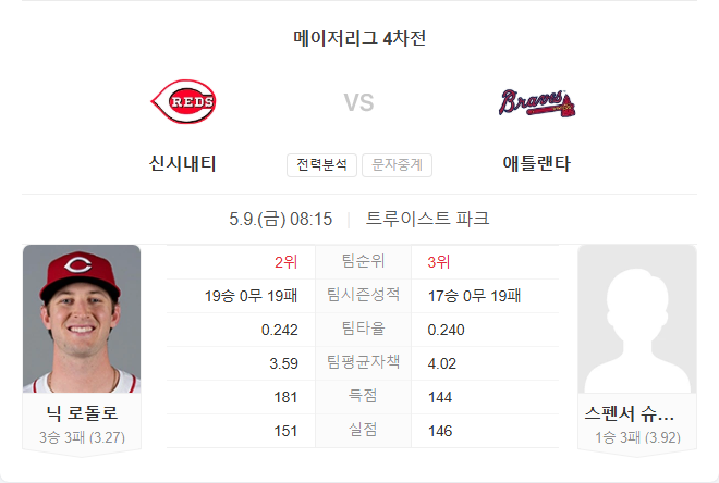 5월 9일 MLB 메이저리그 신시내티 레즈 VS 애틀랜타 브레이브스 타카짱의 경기 예측 분석