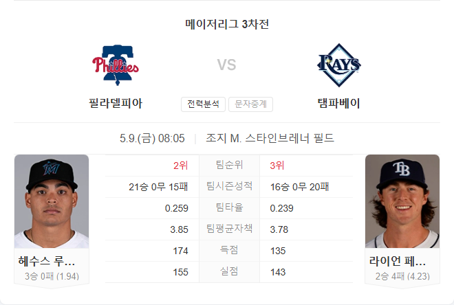 타선의 파괴력, 선발진의 안정감, 최근 흐름까지 모두 필라델피아가 우세합니다. 루사르도는 안정적인 투구를 이어가고 있으며, 슈와버와 터너 중심의 타선은 탬파베이 투수진을 상대로도 충분한 득점을 기대할 수 있습니다.