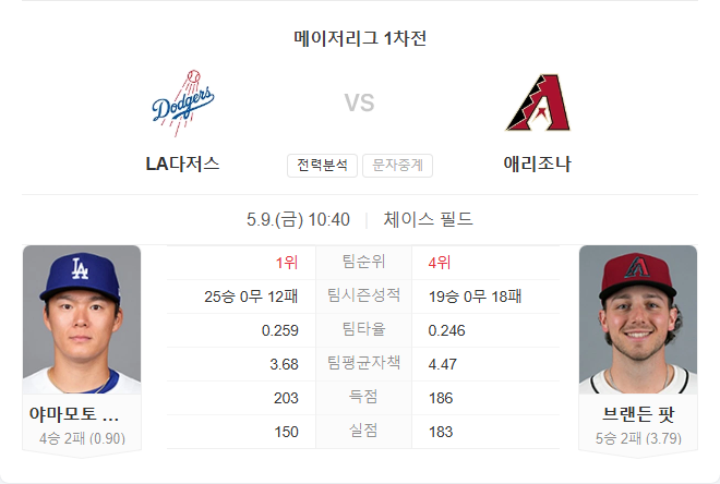 5월 9일 MLB 메이저리그 LA 다저스 VS 애리조나 다이아몬드백스 타카짱의 경기 예측 분석