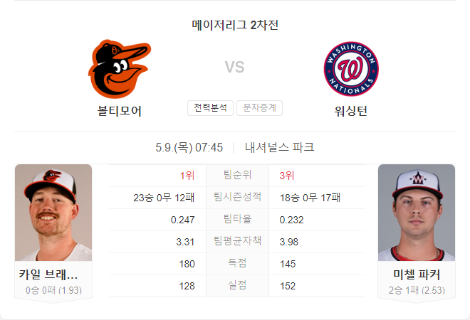 5월 9일 MLB 볼티모어 오리올스 VS 워싱턴 내셔널스 타카짱의 경기 예측 분석
