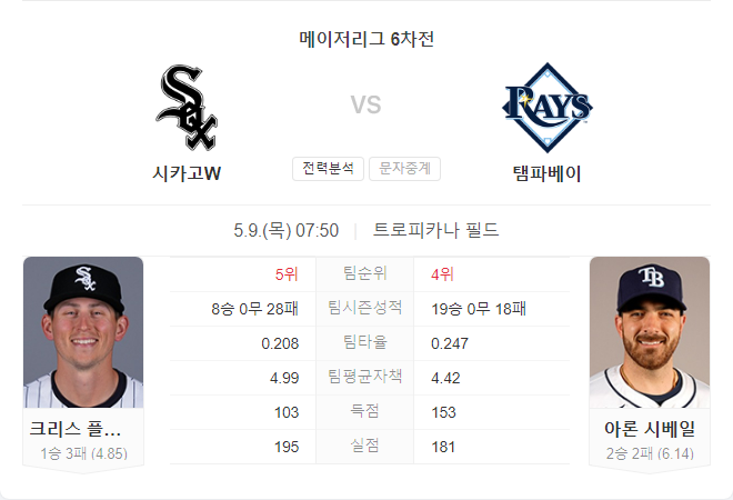 탬파베이는 홈에서의 강점을 살리며 시리즈 첫 경기에서 복수를 노릴 것입니다. 시카고는 최근 탬파베이를 상대로 좋은 성적을 거두었지만, 일관성 없는 경기력이 문제입니다. 시발레는 최근 부진했지만 홈에서의 반등 가능성을 배제할 수 없으며, 플렉센도 상승세를 이어가려 할 것입니다.