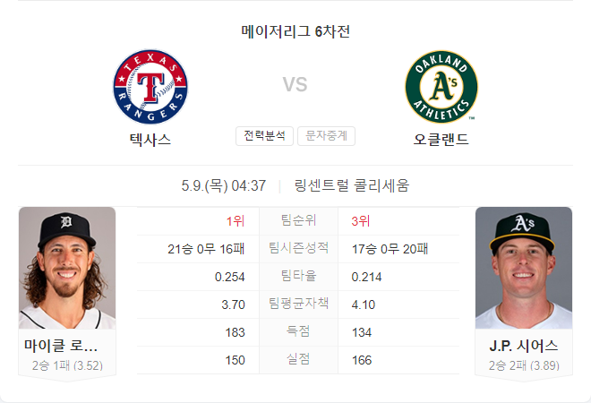5월 9일 MLB 텍사스 레인저스 VS 오클랜드 어슬레틱스 타카짱의 경기 예측 분석