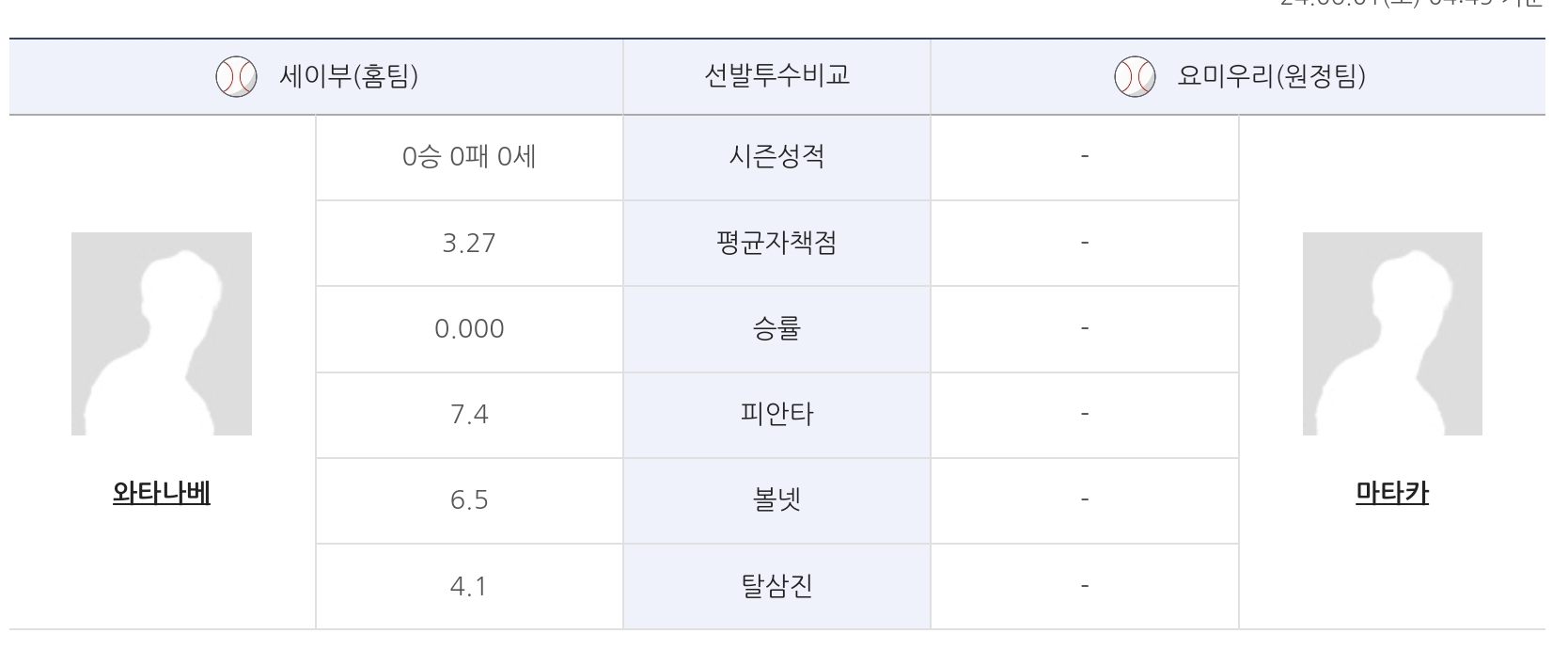 세이부 라이온스는 어제 요미우리 자이언츠에게 1-4로 패배하였습니다. 나카무라가 솔로 홈런을 치긴 했지만, 팀은 전체적으로 3안타 1득점에 그쳤습니다. 오늘 세이부의 선발 투수는 와타나베 유타로로, 이번 시즌 첫 선발 등판입니다. 반면, 요미우리 자이언츠의 선발은 마타키 텟페이로, 역시 이번 시즌 첫 선발 등판입니다.