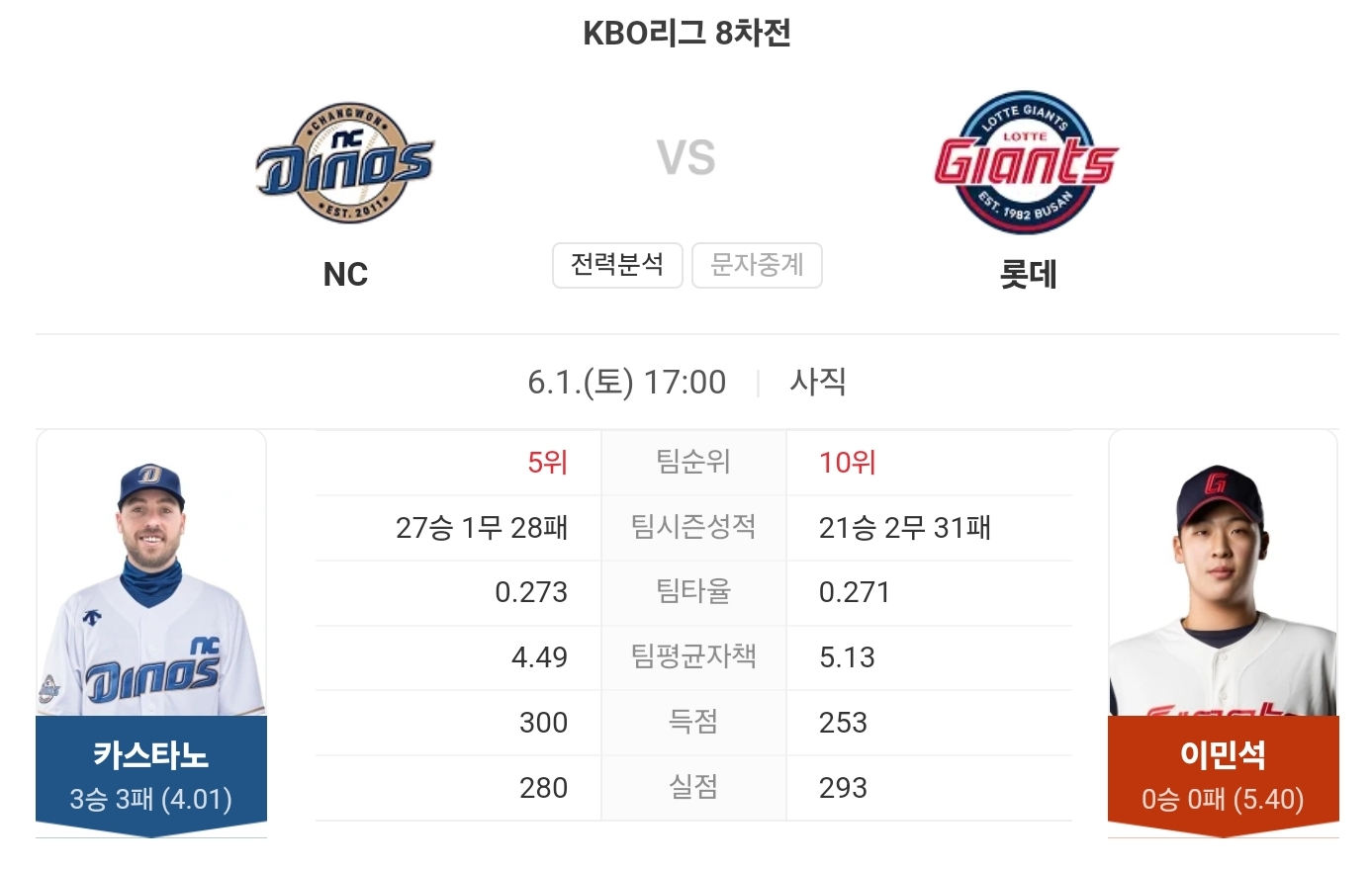 반면, NC는 원정 타격이 좋아졌으나 투수진의 불안정이 문제입니다. 롯데는 후반 타격전에서 강점을 보이고 있어, 이번 경기에서는 롯데 자이언츠가 승리에 가까울 것으로 예상됩니다.