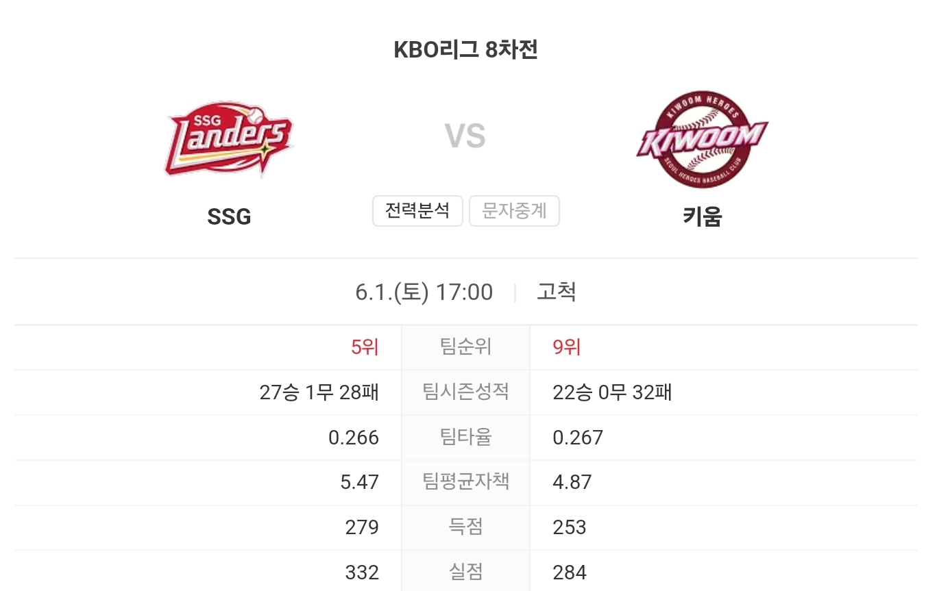 6월 1일 KBO 프로야구 SSG 랜더스 VS 키움 히어로즈 타카짱의 경기 예측 분석