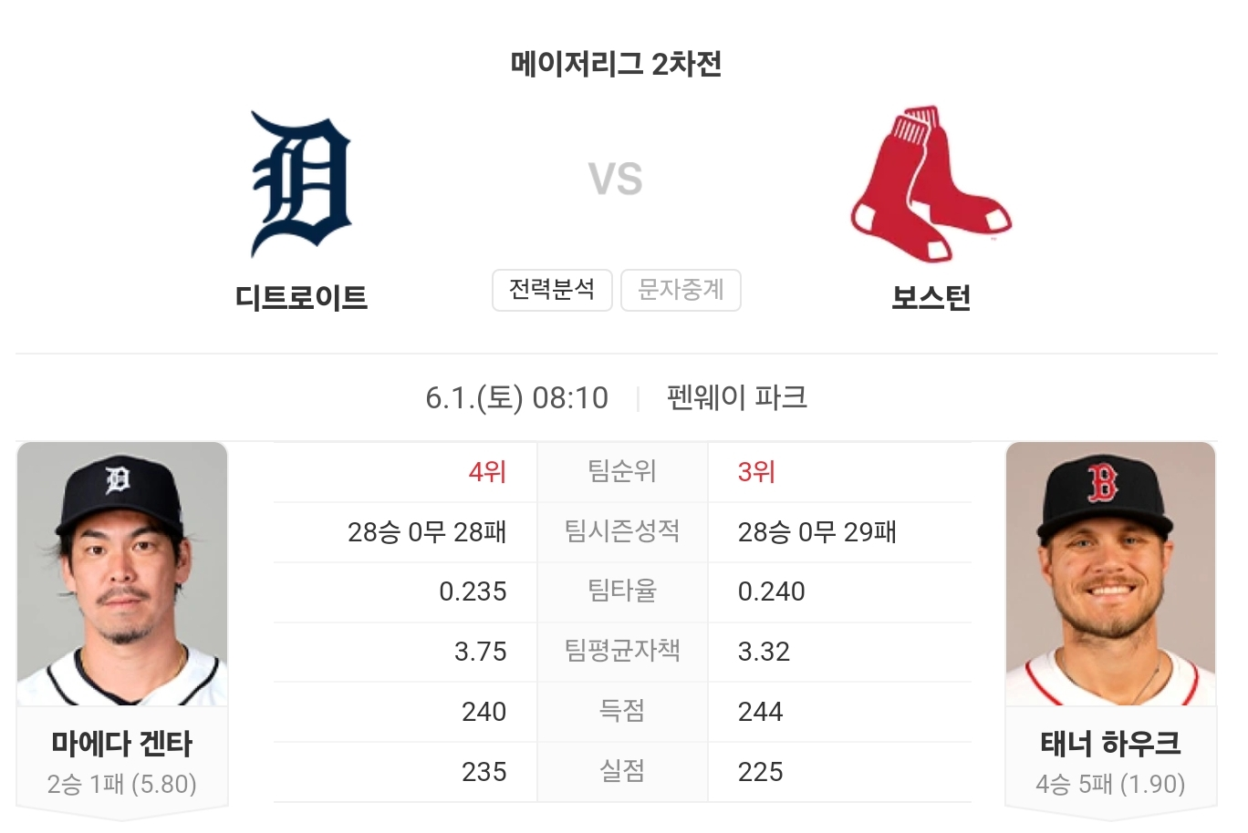 이번 경기는 디트로이트 타이거즈의 타선이 보스턴 레드삭스의 선발 투수 하우크를 상대로 얼마나 효과적으로 공격할 수 있을지가 관건입니다. 반면 보스턴은 마에다의 투구를 어떻게 공략할지가 중요합니다. 하우크의 안정적인 투구와 보스턴의 홈 경기 이점을 고려했을 때, 보스턴 레드삭스가 유리할 것으로 보입니다.
