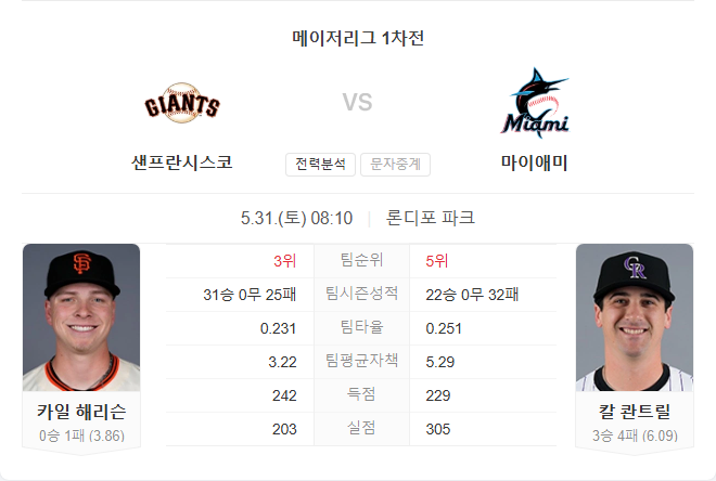 6월 1일 MLB 메이저리그 샌프란시스코 자이언츠 VS 마이애미 말린스 타카짱의 경기 예측 분석
