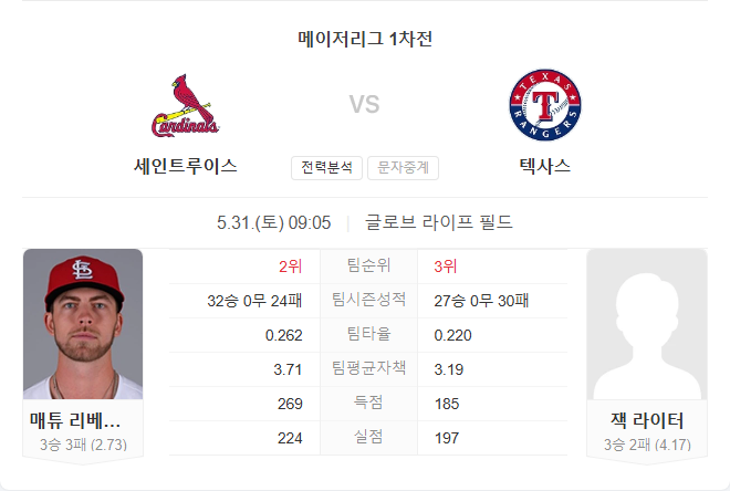 세인트루이스는 최근 타선과 불펜이 모두 안정된 흐름을 보이며 상승세에 있습니다. 반면 텍사스는 타선이 완전히 침체돼 있고, 마운드 역시 불안한 상황입니다. 리버레이터가 안정적인 시즌을 이어가고 있는 반면, 잭 라이더는 피안타와 볼넷 관리에 어려움을 겪고 있어 세인트루이스 타선의 집중력이 빛을 발할 가능성이 높습니다.