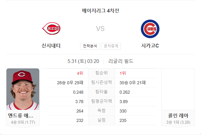 레즈는 애벗의 꾸준하고 안정적인 피칭이 강점이며, 최근 컵스와의 맞대결에서도 완성도 높은 경기를 펼쳤습니다. 타선이 득점권 집중력만 회복한다면 원정에서도 충분히 경쟁력을 갖출 수 있습니다. 반면 컵스는 팀 분위기와 최근 흐름은 좋지만, 선발 레아가 레즈 상대로 약세를 보인다는 점이 불안 요소입니다.