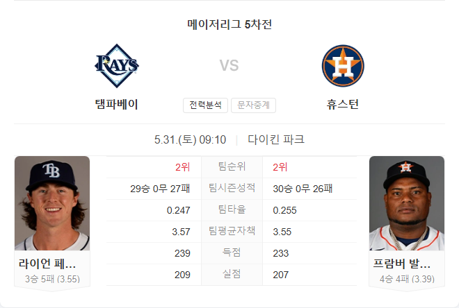 양 팀 모두 최근 분위기는 좋지만, 발데스가 이끄는 휴스턴 마운드가 홈에서 더욱 견고하며, 파레데스를 중심으로 한 타선의 활약도 인상적입니다. 페피오트가 직전 경기에서 호투했지만 시즌 전체 흐름에서 불안 요소가 남아 있어, 전력의 안정성과 최근 흐름을 고려했을 때 휴스턴이 우세한 흐름을 이어갈 가능성이 높습니다.