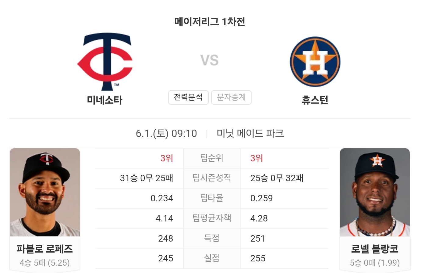 6월 1일 MLB 미네소타 트윈스 VS 휴스턴 애스트로스 타카짱의 경기 예측 분석