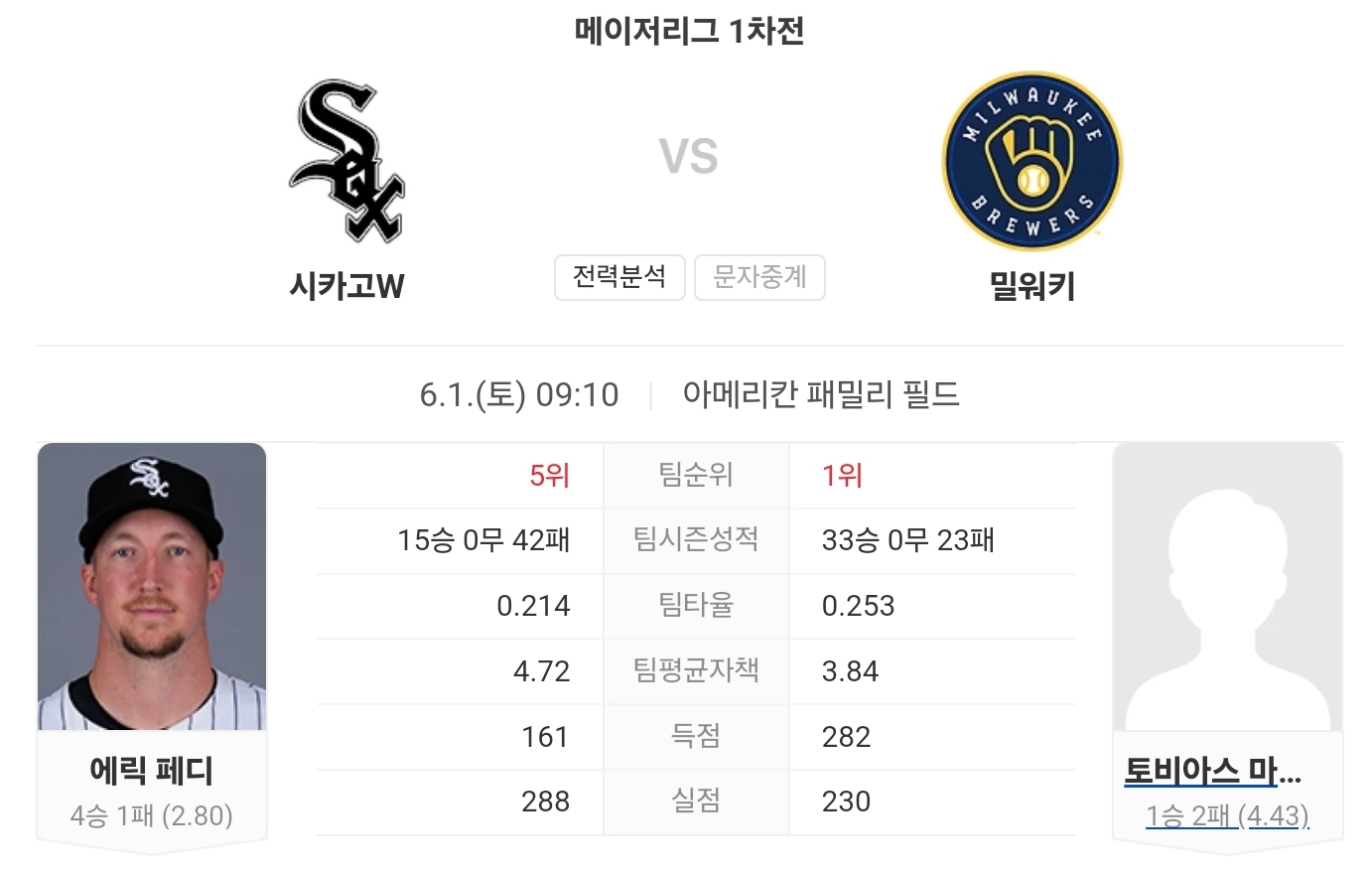 6월 1일 MLB 시카고 화이트삭스 VS 밀워키 브루어스 타카짱의 경기 예측 분석