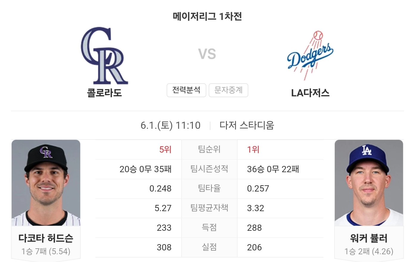 다저스는 최근 경기에서 다시 좋은 폼을 되찾았으며, 강력한 타선을 자랑합니다. 특히, 포수 윌 스미스가 최근 10경기에서 5개의 홈런을 기록하며 좋은 활약을 보이고 있습니다. 반면, 로키스는 원정 경기에서 타율 .233을 기록하며 고전하고 있습니다. 또한, 로키스 선발 허드슨은 이번 시즌 전반적으로 부진한 성적을 기록하고 있어, 다저스의 강력한 타선을 상대로 고전할 가능성이 큽니다.