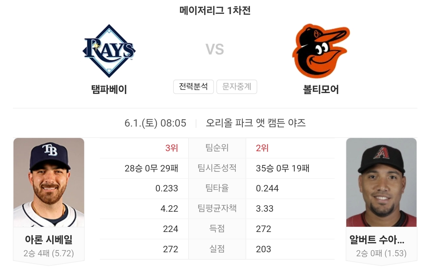 이번 경기는 볼티모어 오리올스의 승리가 예상됩니다. 오리올스는 최근 경기에서 강력한 성적을 기록하고 있으며, 수아레즈의 안정적인 피칭이 큰 역할을 할 것으로 보입니다. 반면, 레이스는 시발레의 불안정한 피칭이 팀 성적에 부정적인 영향을 미칠 가능성이 큽니다. 따라서 오리올스가 승리를 거둘 확률이 높습니다.