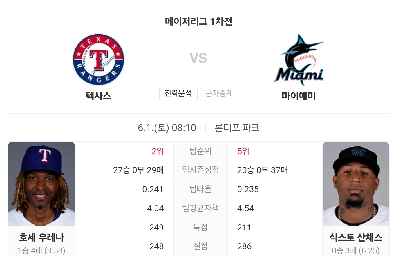 6월 1일 MLB 텍사스 레인저스 VS 마이애미 말린스 타카짱의 경기 예측 분석