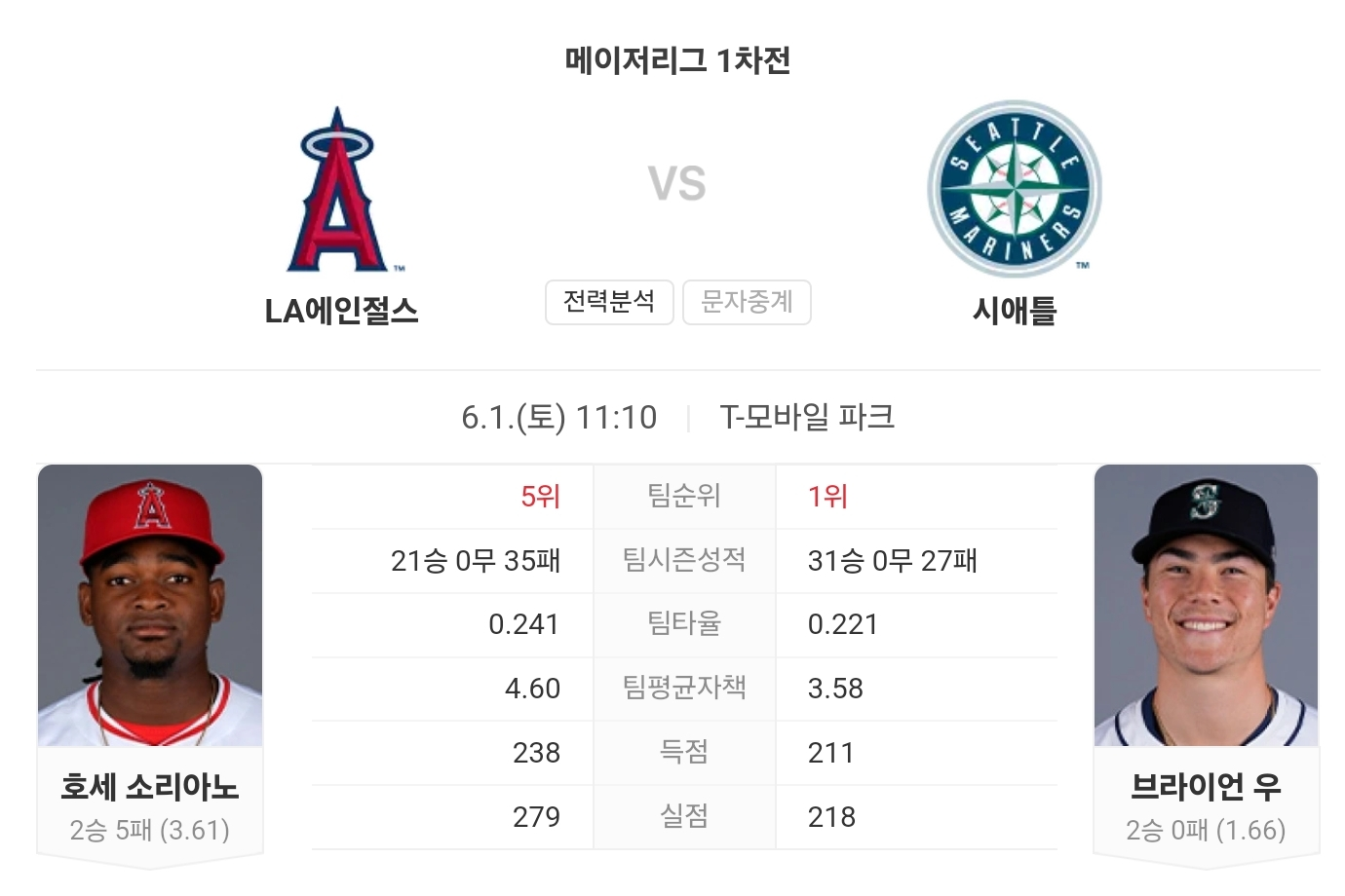 시애틀 매리너스는 최근 좋은 경기력을 유지하고 있으며, 특히 브라이언 우의 안정적인 투구가 기대됩니다. LA 에인절스는 타선에서 고전하고 있으며, 호세 소리아노의 기복 있는 투구가 변수로 작용할 가능성이 큽니다. 따라서 이번 경기는 시애틀 매리너스가 승리할 가능성이 높아 보입니다.