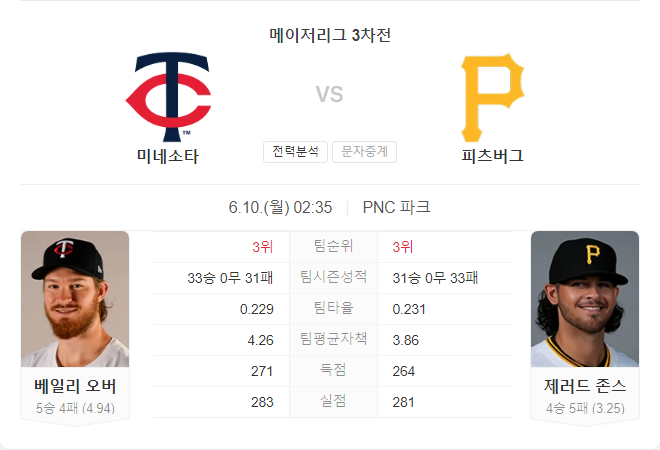 트윈스는 최근 공격력이 침체된 모습을 보이며, 특히 피츠버그 원정에서 3-0, 4-0으로 패배했습니다. 선발 투수 베일리 오버는 이번 시즌 5승 4패, 평균자책점 4.94를 기록하고 있으며, 최근 경기에서 5이닝 동안 3실점을 허용했습니다.