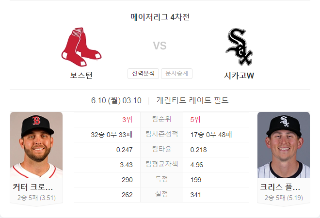 6월 10일 MLB 보스턴 레드삭스 VS 시카고 화이트삭스 타카짱의 경기 예측 분석
