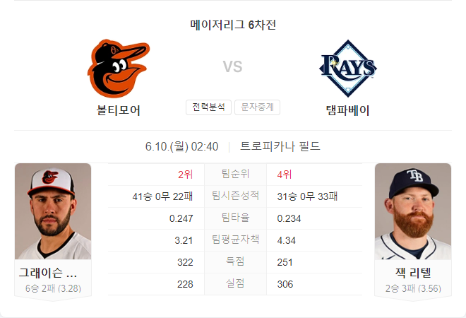 탬파베이의 이번 경기 선발 투수는 우완 투수 잭 리텔입니다. 리텔은 시즌 2승 3패, 평균자책점 3.56, WHIP 1.29를 기록 중이며, 최근 볼티모어를 상대로 6이닝 동안 3실점을 허용했습니다. 그는 강력한 볼티모어 타선을 상대하는 데 어려움을 겪을 가능성이 큽니다.