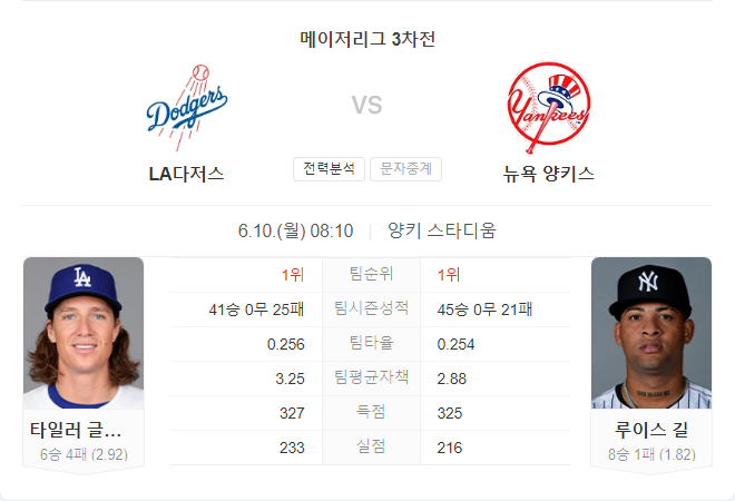 이번 경기는 두 팀 모두 강력한 선발 투수들이 나서는 만큼 저득점 경기가 예상됩니다. 다저스는 타일러 글래스노가 리그에서 가장 많은 삼진을 기록하고 있으며, 양키스는 루이스 길이 뛰어난 평균자책점으로 시즌 내내 안정적인 피칭을 보여주고 있습니다.