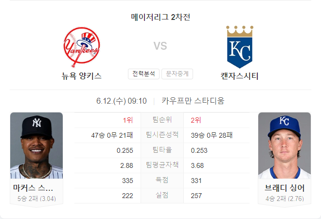 이번 경기는 뉴욕 양키스가 약간의 우위를 점할 것으로 보입니다. 마커스 스트로먼은 시즌 전반적으로 안정적인 투구를 보여주고 있으며, 로열스의 브래디 싱어도 좋은 성적을 기록하고 있지만, 최근 경기에서 다소 부진한 모습을 보였습니다.
