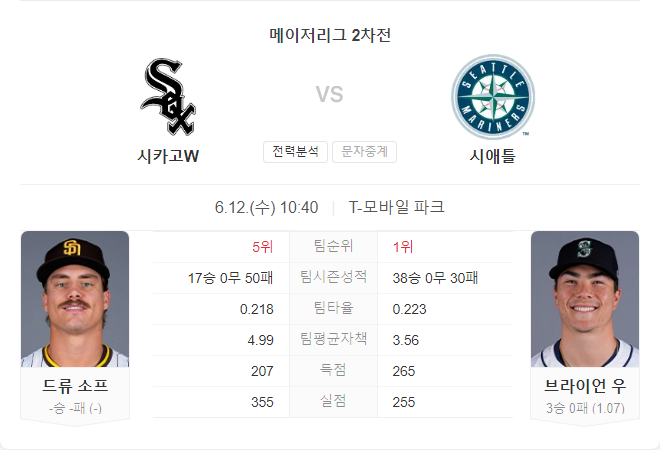 시애틀 매리너스는 38승 30패로 AL 서부지구 선두를 유지하고 있습니다. 이번 경기에 선발로 나서는 브라이언 우는 33이닝 동안 평균자책점 1.80을 기록하며 강력한 모습을 보이고 있습니다. 매리너스 타선은 경기당 평균 3.84점을 기록하며, 주로 조쉬 로하스와 딜런 무어가 팀을 이끌고 있지만 나머지 타자들은 큰 활약을 보이지 못하고 있습니다.