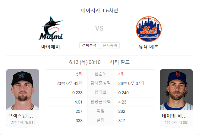 반면 말린스는 타선의 부진으로 인해 득점력이 떨어지고 있으며, 브랙스턴 가렛이 좋은 성적을 보이고 있음에도 불구하고 팀 전체의 역량이 부족한 상황입니다. 데이비드 피터슨이 최근 좋은 모습을 이어간다면, 메츠가 이번 경기를 유리하게 이끌어갈 가능성이 큽니다.