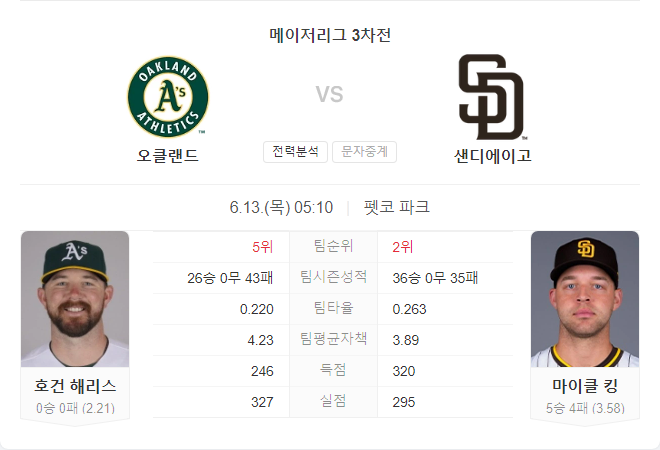 이번 경기는 샌디에이고 파드리스가 유리할 것으로 예상됩니다. 샌디에이고는 최근 좋은 흐름을 유지하고 있으며, 홈에서의 경기 이점을 살려 승리할 가능성이 큽니다. 오클랜드는 타선의 부진과 불안한 마운드로 인해 어려움을 겪을 가능성이 있습니다.