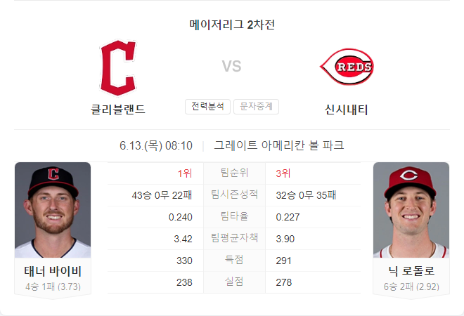 클리블랜드의 탠너 비비가 시즌 전체로는 좋은 성적을 보이고 있지만, 최근 경기에서의 부진이 우려되는 상황입니다. 레즈의 타선이 비비를 상대로 득점을 만들어낼 가능성이 높으며, 홈에서의 경기라는 점도 신시내티에게 유리하게 작용할 것입니다.