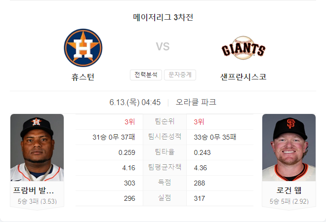 반면, 휴스턴 애스트로스는 프람버 발데스가 선발로 나서긴 하지만, 최근 팀 전체의 부진과 주요 선수들의 부상으로 인해 어려운 경기를 펼칠 가능성이 큽니다. 샌프란시스코는 홈 경기에서의 강점을 살려 휴스턴을 상대로 승리를 거둘 가능성이 높습니다.