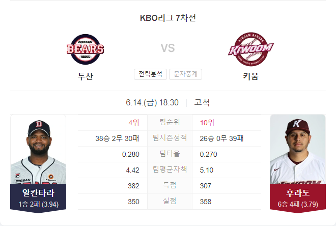 키움 히어로즈는 최근 5경기에서 불펜진이 ERA 4.41을 기록하며 다소 불안정한 피칭을 보이고 있습니다. 팀 타율은 0.269로 두산에 비해 약간 낮지만, 여전히 강력한 타선으로 상대팀을 압박하고 있습니다. 하지만 올 시즌 두산을 상대로 1승 4패를 기록하며 두산에게 약한 모습을 보이고 있어, 이번 경기도 쉽지 않을 것으로 예상됩니다.
