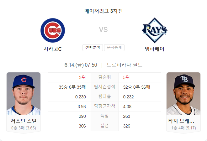 양 팀 모두 최근 부진한 성적을 보이며 어려움을 겪고 있지만, 시카고 컵스의 선발 저스틴 스틸이 최근 안정적인 투구를 이어가고 있어 시카고가 다소 유리할 것으로 보입니다. 탬파베이 레이스는 홈 경기에서 강한 모습을 보이고 있지만, 브래들리의 부진한 투구가 변수로 작용할 가능성이 큽니다. 따라서 이번 경기는 시카고 컵스의 승리가 예상됩니다.