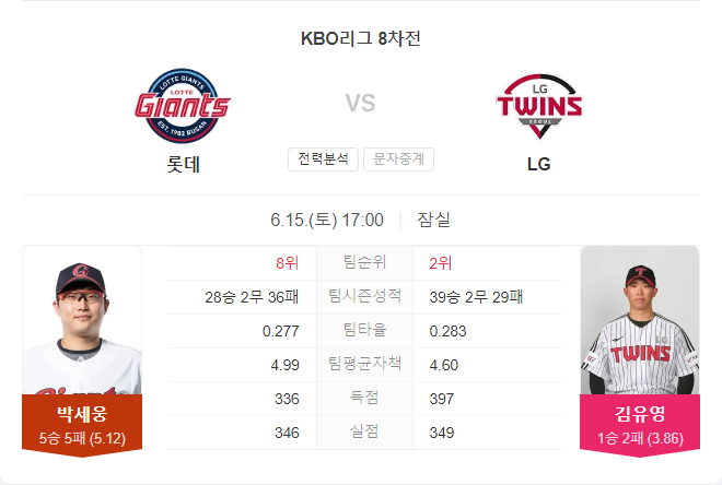 6월 15일 KBO 프로야구 롯데 자이언츠 VS LG 트윈스 타카짱의 경기 예측 분석