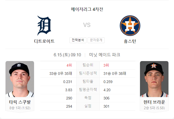 6월 15일 MLB 디트로이트 타이거즈 VS 휴스턴 애스트로스 타카짱의 경기 예측 분석